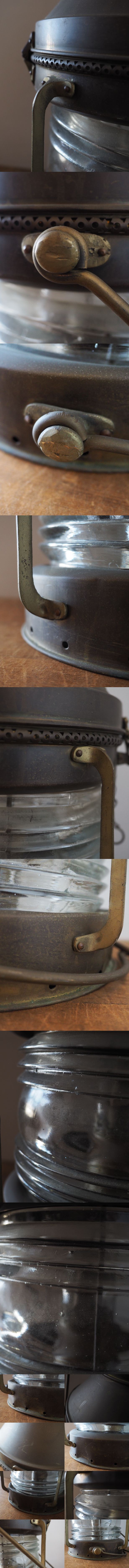 堅牢に作られたリベットやハンドル、光を広く拡散する分厚いガラスなど、無骨な佇まいが味わい深い一品です。